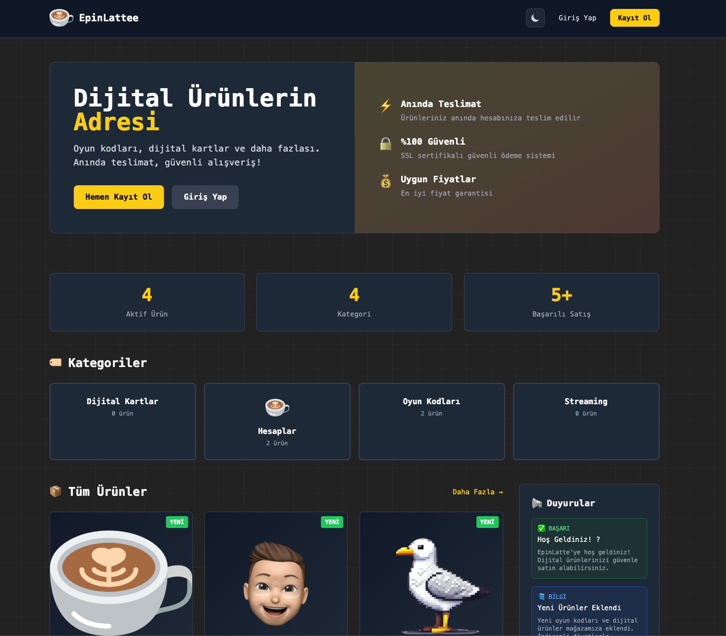 EpinLatte, dijital ürün (epin, kod, hesap) satışı için geliştirilmiş modern bir web uygulamasıdır. Fat-Free Framework ile geliştirilmiş olup, paylaşımlı hostinglerde (cPanel) sorunsuz çalışacak şekilde optimize edilmiştir. ## ✨ Temel Özellikler ### Kullanıcı Özellikleri - ✅ Kullanıcı kayıt ve giriş sistemi - ✅ Bakiye yönetimi (yükleme ve kullanım) - ✅ Kategorilere göre ürün listeleme - ✅ Ürün detay sayfası - ✅ Sepetsiz anında satın alma - ✅ Otomatik teslimat (kod veya hesap) - ✅ Sipariş geçmişi görüntüleme - ✅ İşlem geçmişi (bakiye hareketleri) ### Admin Özellikleri - ✅ Kapsamlı admin paneli - ✅ Ürün yönetimi (ekle, düzenle, sil) - ✅ Kategori bazlı ürün organizasyonu - ✅ Gelişmiş stok yönetimi - ✅ Toplu stok ekleme (metin alanından) - ✅ Sipariş yönetimi ve takibi - ✅ Kullanıcı yönetimi - ✅ İstatistikler ve raporlar - ✅ Dashboard (genel bakış) ### Teknik Özellikler - ✅ PHP 8.0+ uyumlu - ✅ MySQL veritabanı - ✅ Fat-Free Framework (hafif ve hızlı) - ✅ Tailwind CSS (modern UI) - ✅ Responsive tasarım - ✅ cPanel uyumlu - ✅ .htaccess ile güvenli yapılandırma - ✅ PDO prepared statements (SQL injection koruması) - ✅ XSS koruması - ✅ Bcrypt şifre hashleme - ✅ Transaction yönetimi