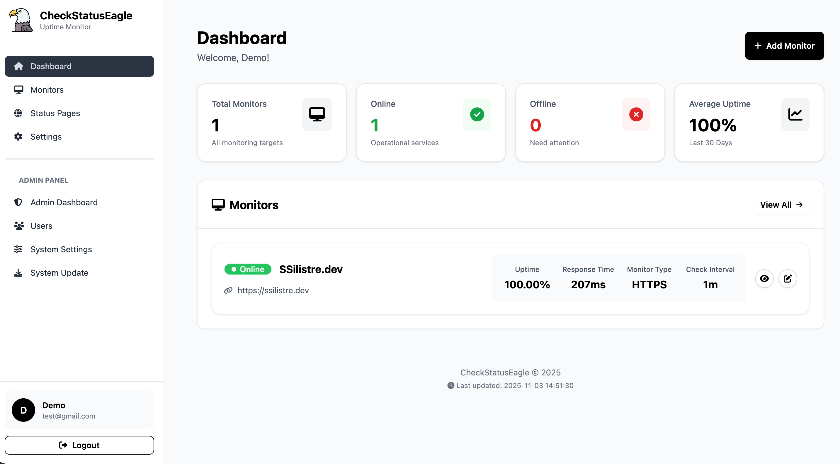 CheckStatusEagle, web sitelerinizi, sunucularınızı ve API'lerinizi takip etmenize yardımcı olan, kendi sunucunuzda barındırabileceğiniz bir çalışma süresi izleme çözümüdür. Birden fazla izleme türü ve güzel kamuya açık durum sayfaları ile destekleyen bu çözüm, güvenilir çalışma süresi takibi ihtiyacı olan işletmeler için mükemmel bir çözümdür.