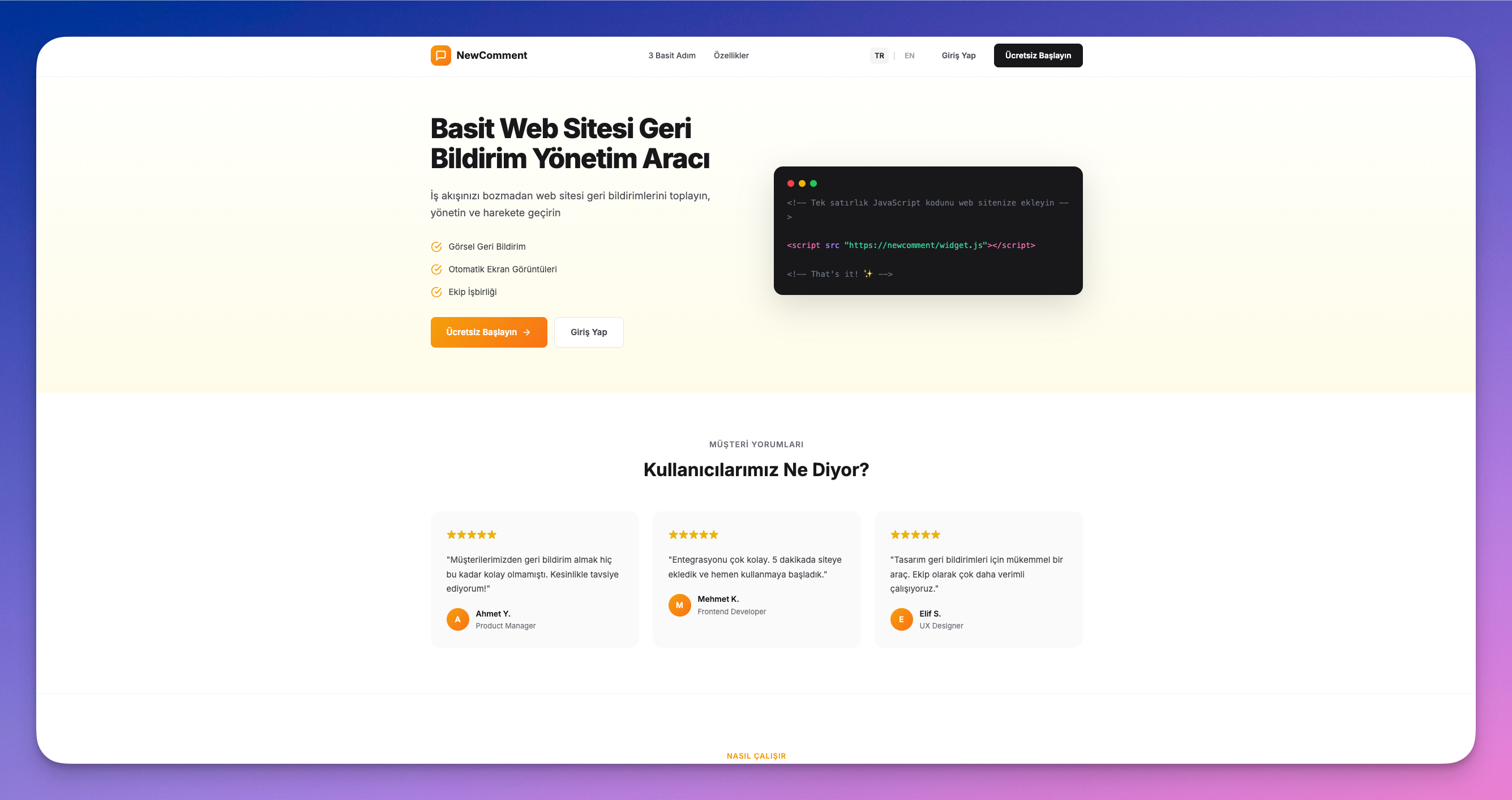 # NewComment Web siteleri için görsel geri bildirim yönetim aracı. ## Özellikler - 📌 **Görsel Geri Bildirim** - Sayfadaki herhangi bir öğeye tıklayarak yorum bırakma - 📸 **Otomatik Ekran Görüntüsü** - Her geri bildirimle birlikte ekran görüntüsü - 👥 **Ekip İşbirliği** - Rol tabanlı yetkilendirme sistemi - 🌍 **Çoklu Dil** - Türkçe ve İngilizce desteği